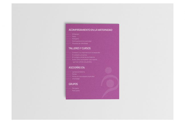 La identidad visual se construye sobre una gama de tonos morados y azules suaves, asociados con la calma, la confianza y la serenidad. Este esquema cromático se aplica en las tarjetas de visita y el folleto informativo, diseñados con una estética limpia y armónica, donde la información fluye de manera clara y accesible.