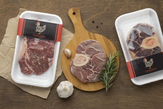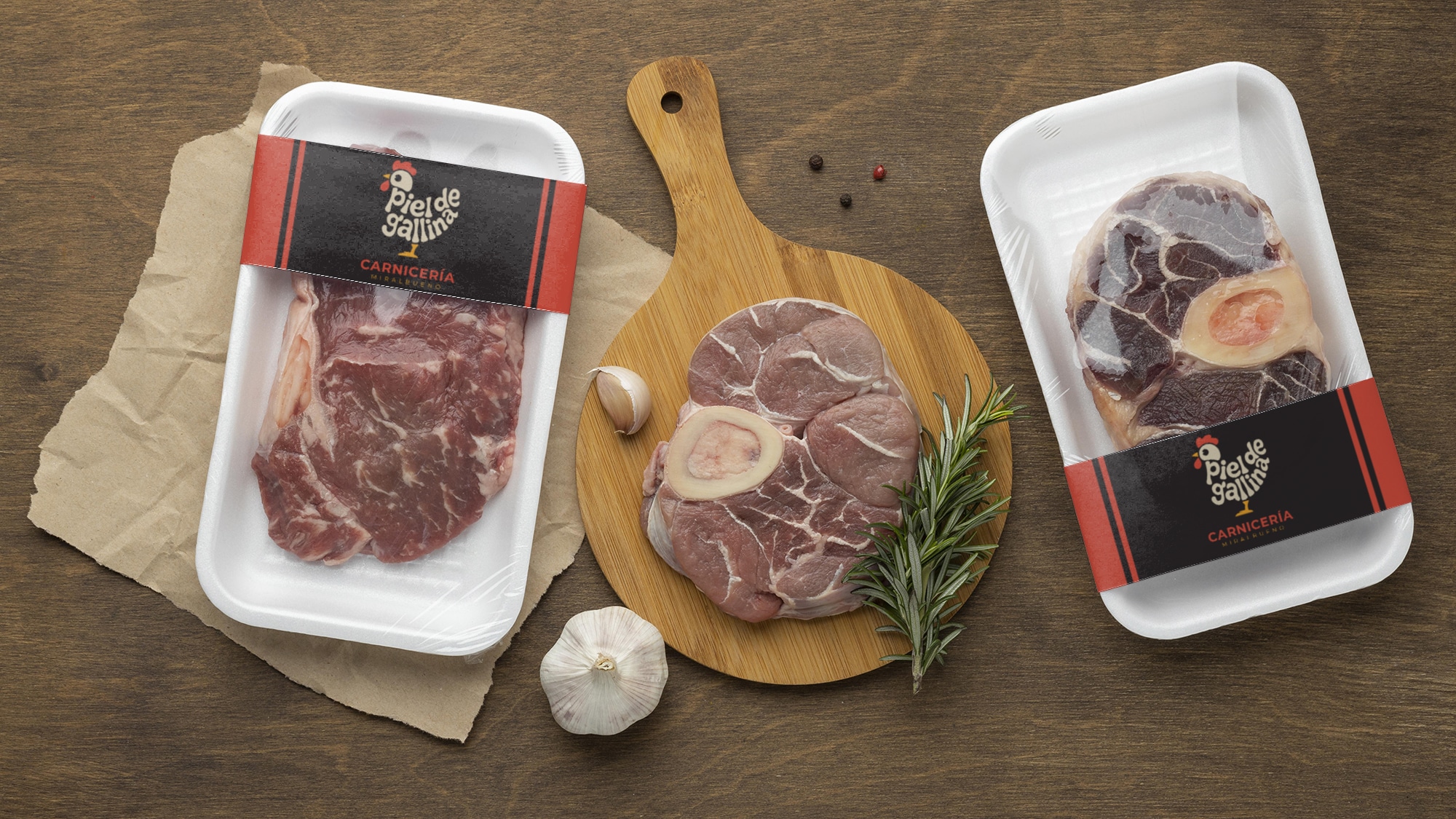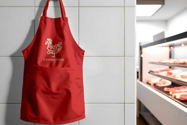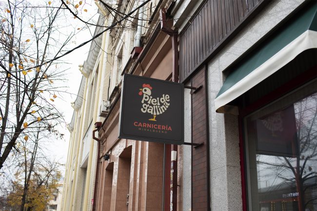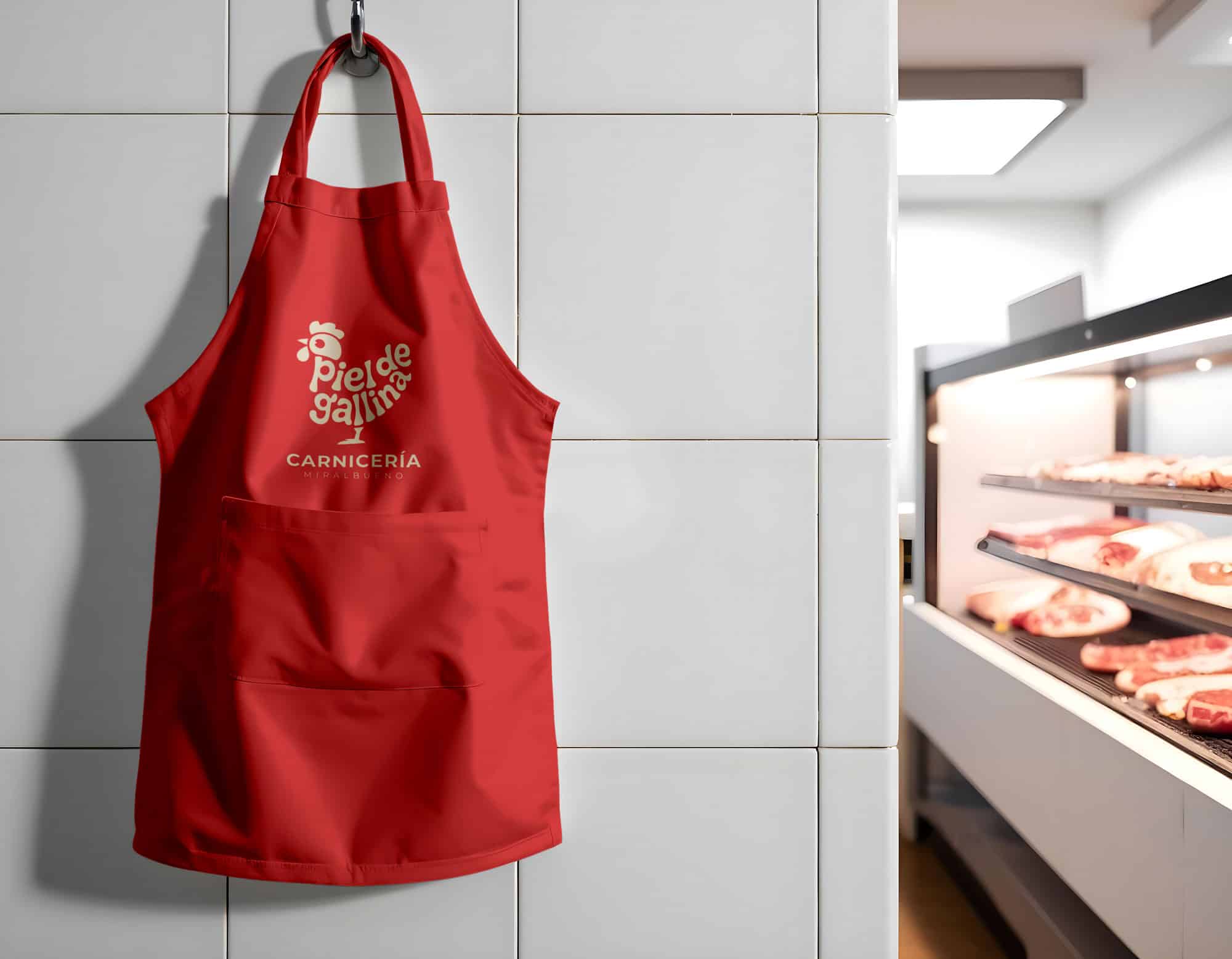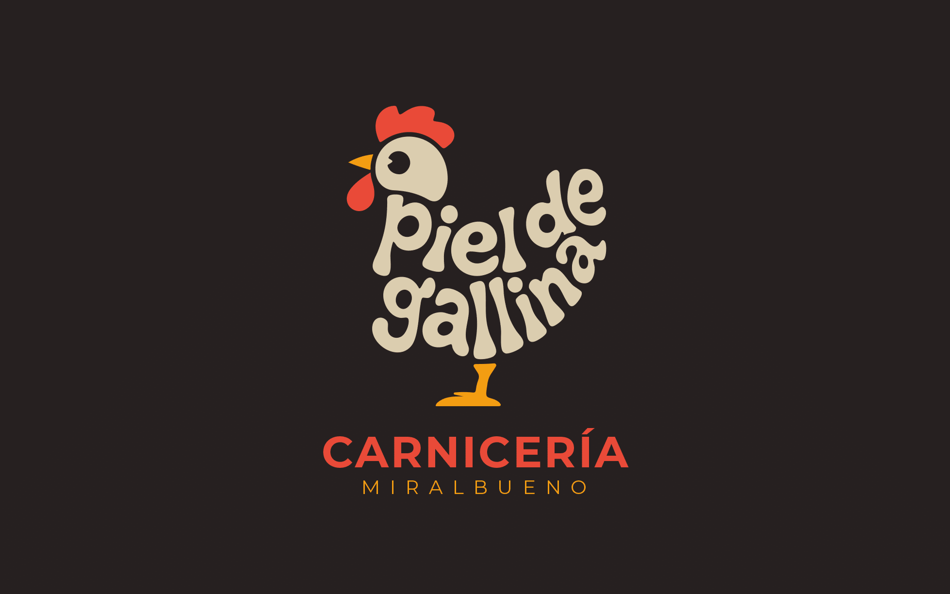 La separación clara entre Piel de Gallina y Carnicería Miralbueno establece una jerarquía eficaz: la marca tiene personalidad propia, mientras que la denominación comercial actúa como descriptor. Esto permite que el logotipo pueda evolucionar o adaptarse a diferentes contextos sin perder identidad.